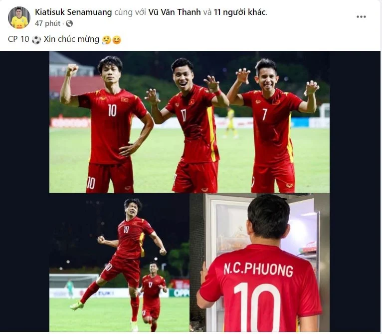 HLV Kiatisak đăng tải lên facebook cá nhân khoảnh khắc Công Phượng ăn mừng kèm hình ảnh ông mặc chiếc áo đấu số 10 của cầu thủ quê Nghệ An.