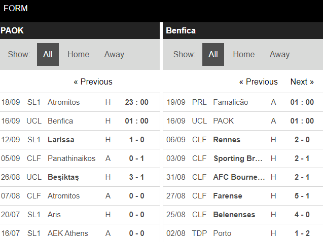 PAOK đang sở hữu phong độ rất cao thời gian gần đây khi đã toàn thắng trong cả 4 lần ra sân vừa qua trên mọi mặt trận. Tính rộng ra, đại diện tới từ Hy Lạp đã không phải nhận bất kì thất bại nào kể từ đầu tháng 7 năm nay. Do đó, họ đang khá tự tin trước thềm cuộc tiếp đón Benfica trên sân nhà.