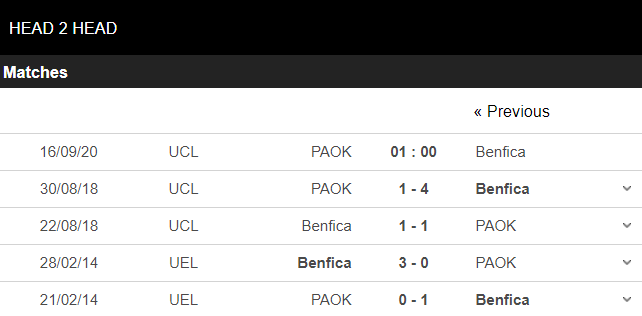 Thành tích đối đầu PAOK vs Benfica